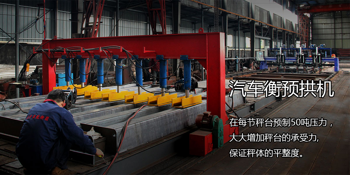 *本公司产品采用国内先进的液压预拱设备,在产品制造过程中,对秤体实行预加引力,每道梁预压6-8吨的力,在每节秤台预制50吨压力,大大增加秤台的承受力,以及梁和面板之间的贴合度,保证秤体的平整度,也是在我省首先使用该先进工艺的企业。
